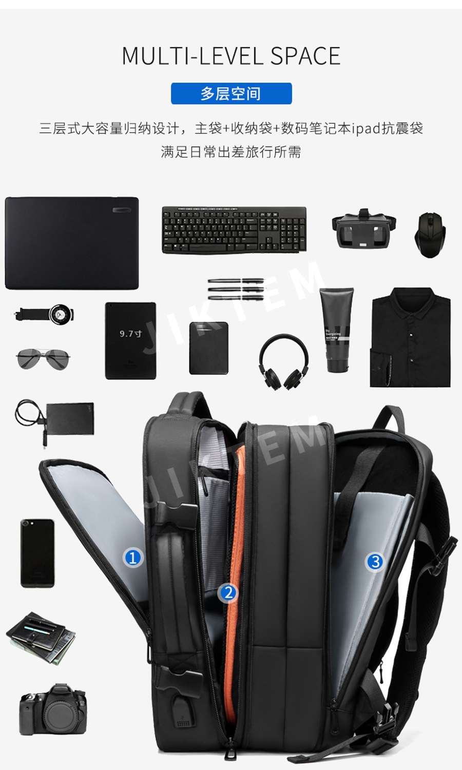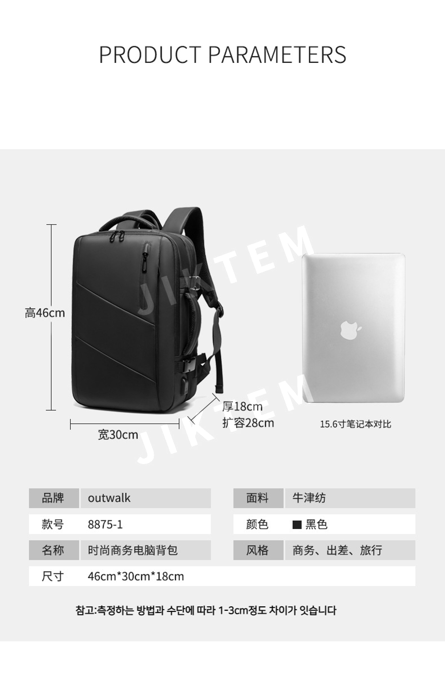 노트북백팩 16인치 확장형 대용량 여행 출장 기내용 JIKTEM BW5092508